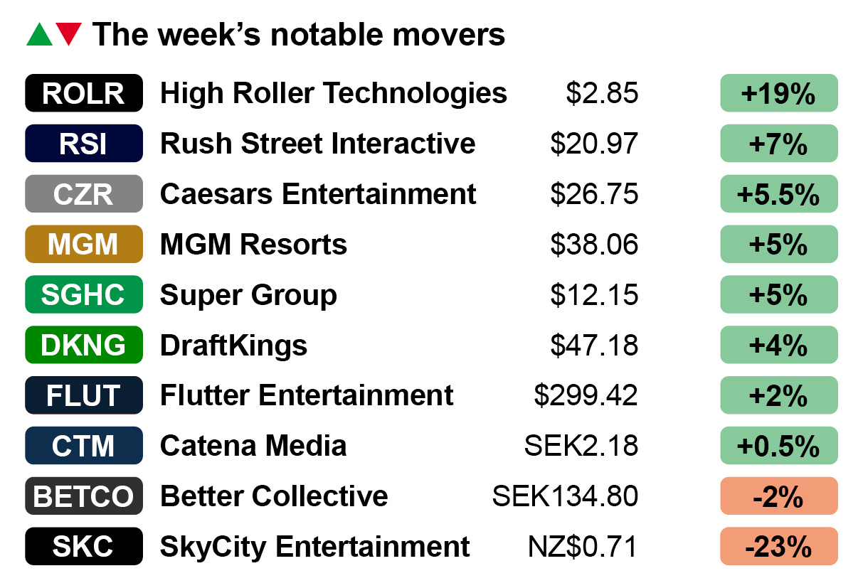 High, ho, silver lining: High Roller Technologies enjoyed the best performance this week, up 19%, on the news that it has gained acceptance for its plan to regain listing compliance with the NYSE American.