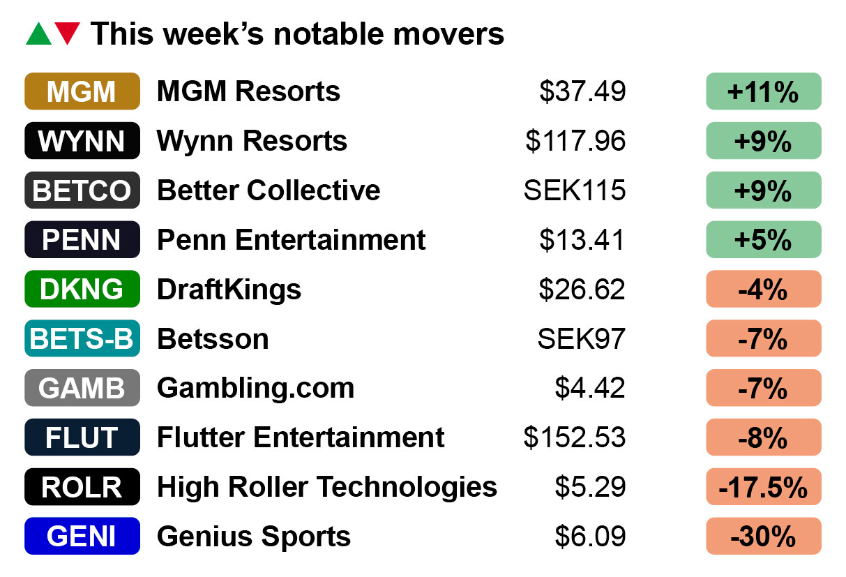 Flutter Entertainment, down 8% for the week, and DraftKings, off by 4%, continued to see their share prices suffer because of fears over what the slowing handle performance says about the potential for prediction-market cannibalization.