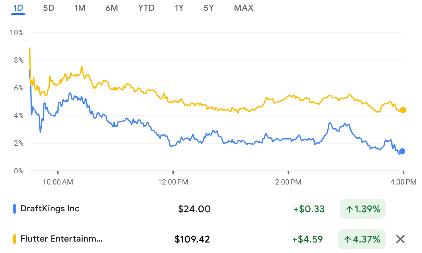 However, despite opening sharply up, the enthusiasm diminished as the day progressed, with DraftKings ending the day up just over 1% and Flutter managing a barely more respectable 4% uplift.