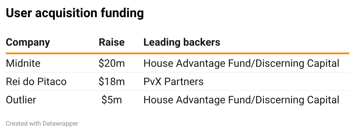 User acquisition funding aside, it participated in funding rounds for Yaspa, BettorWatch, Midnite, Outlier and Slot Cycle.