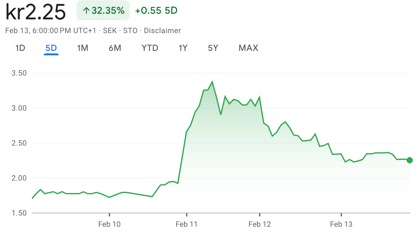 At around SEK2.25 (25¢), it is more than 90% down from its peak in the summer of 2021 when a share was worth SEK75.
